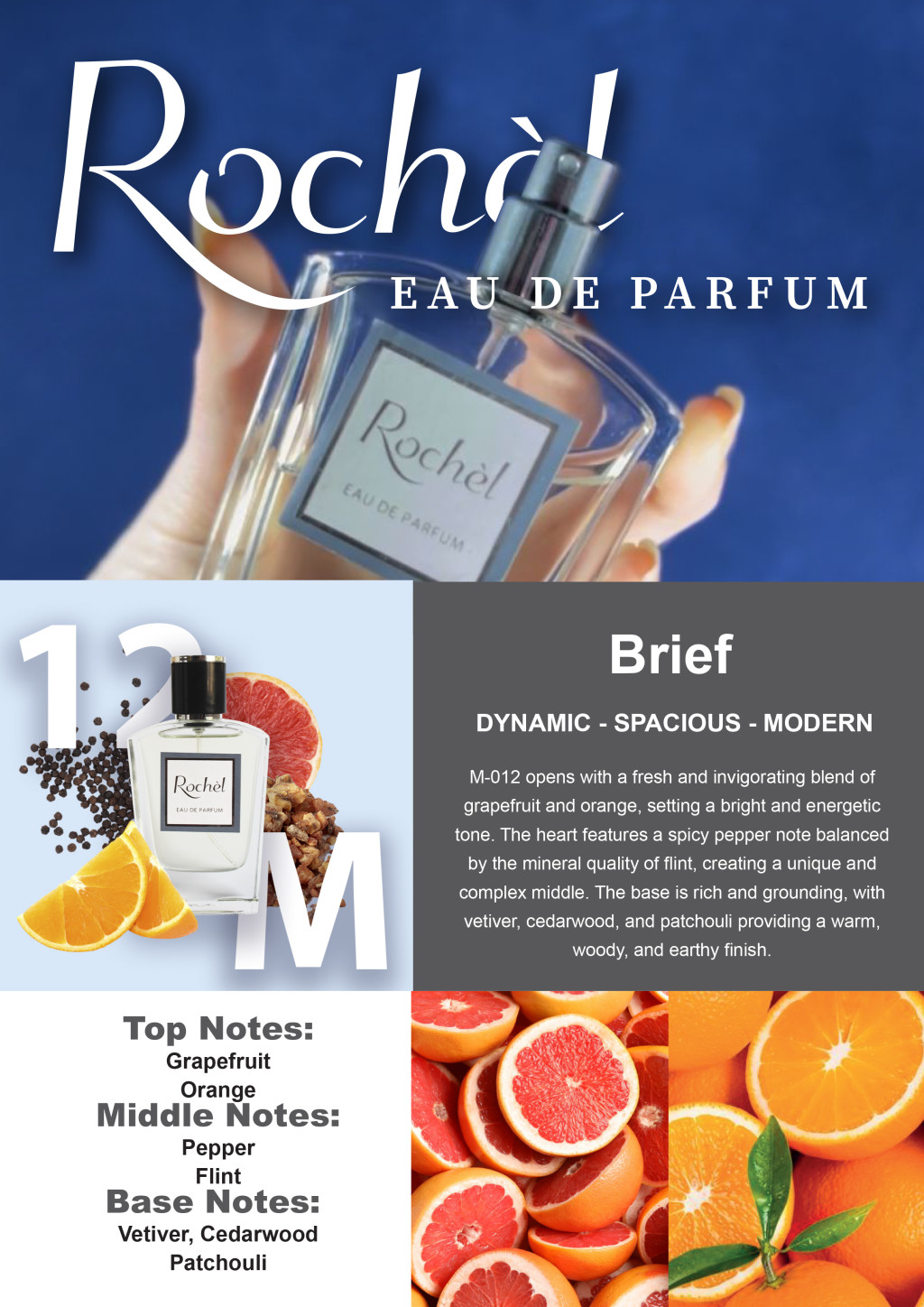 The top notes combine the freshness of orange and grapefruit, while the middle notes are dominated by spicy hints of pepper and flint.